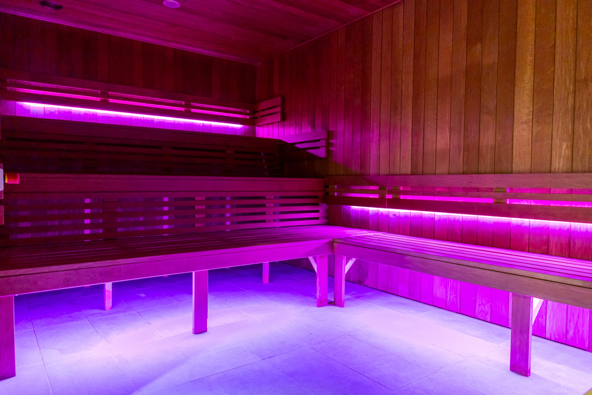 Wykonaliśmy dużą saunę publiczną oraz całe saunarium na terenie pływalni miejskiej Bąbelek w Legnicy. Sauna oraz trzy rzędowe siedziska wykończone zostały drewnem osika termo. Ściana frontowa została w połowie przeszklona a za piecami wykonana została ściana z cegieł łupkowych.