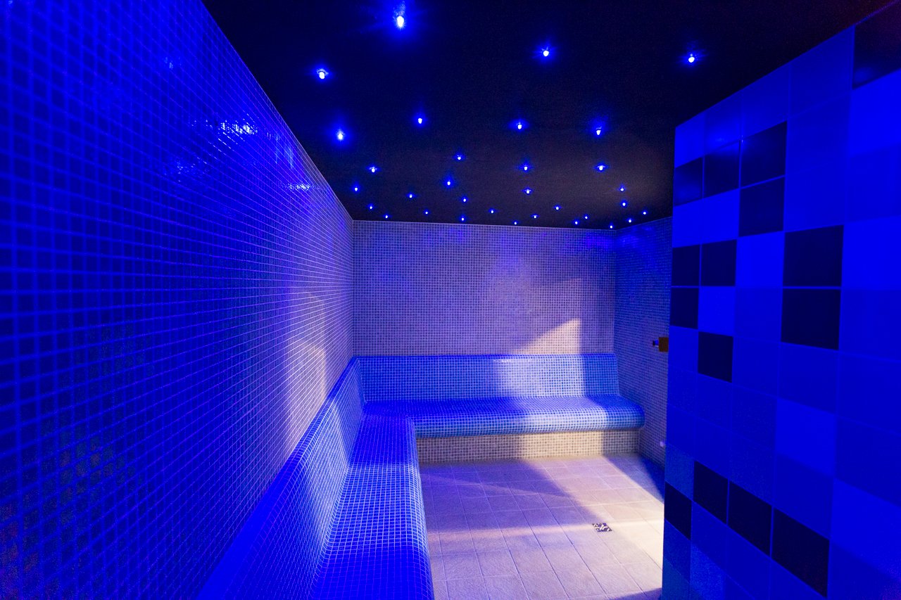 Wykonaliśmy strefę saunarium na terenie Pływalni Miejskiej w Świebodzicach a w niej łaźnię parową. Kabina została wykonana z mozaiki szklanej oraz płytek ceramicznych. Dodatkowo zastosowano podświetlenie w formie koloroterapii RGB.
